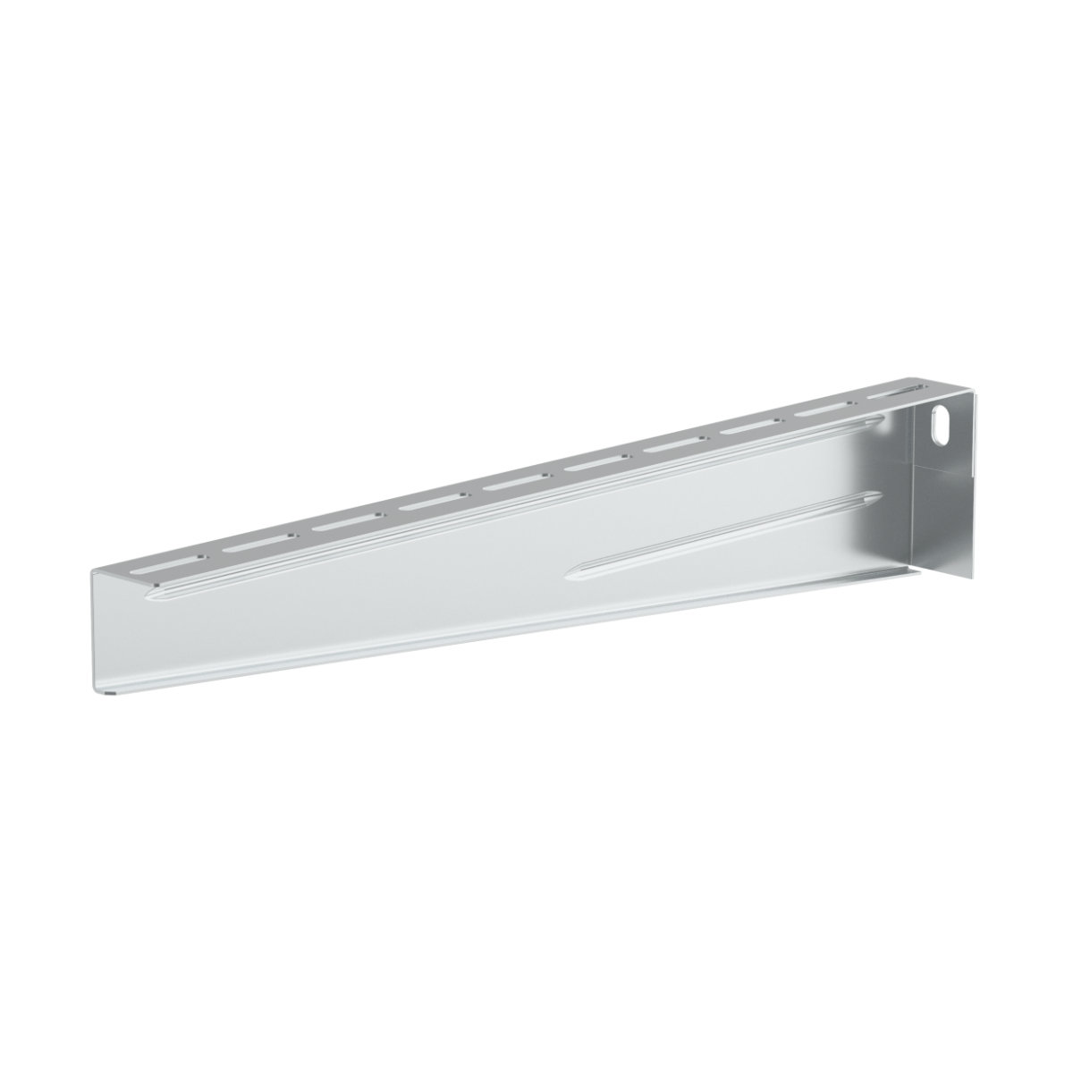 The bracket is used as an element to create a supporting structure for a cable tray. It is designated for installation on the wall or mounting profile. Attached to the wall using Ø 8 mm anchors. NIXSM 6X10 bolts are used to attach the cable tray to the bracket. To protect the cables, the bolt head is inside the cable tray.